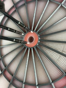 ダーツの練習では、基本的には真ん中のBULL(ブル)と呼ばれる所を狙っておりそこに3本連続で刺さる事をHattrick(ハットトリック)と言います。